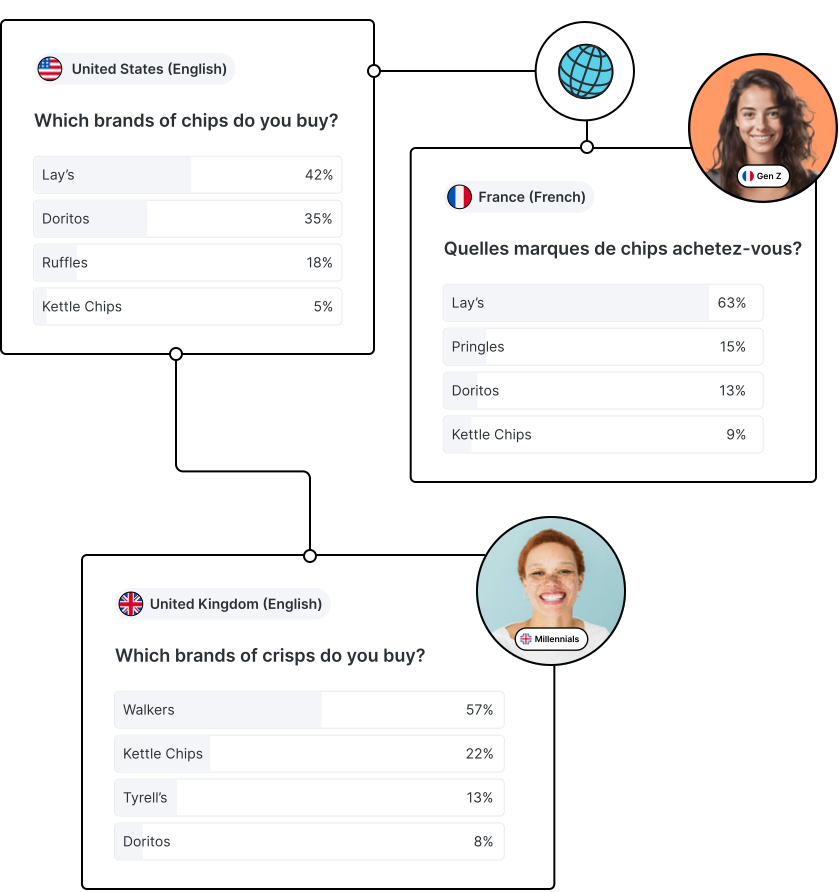 Attest makes it possible to get insights from across all your markets in a single dashboard. Choose to localise language, questions, answers and media to reflect local nuances.